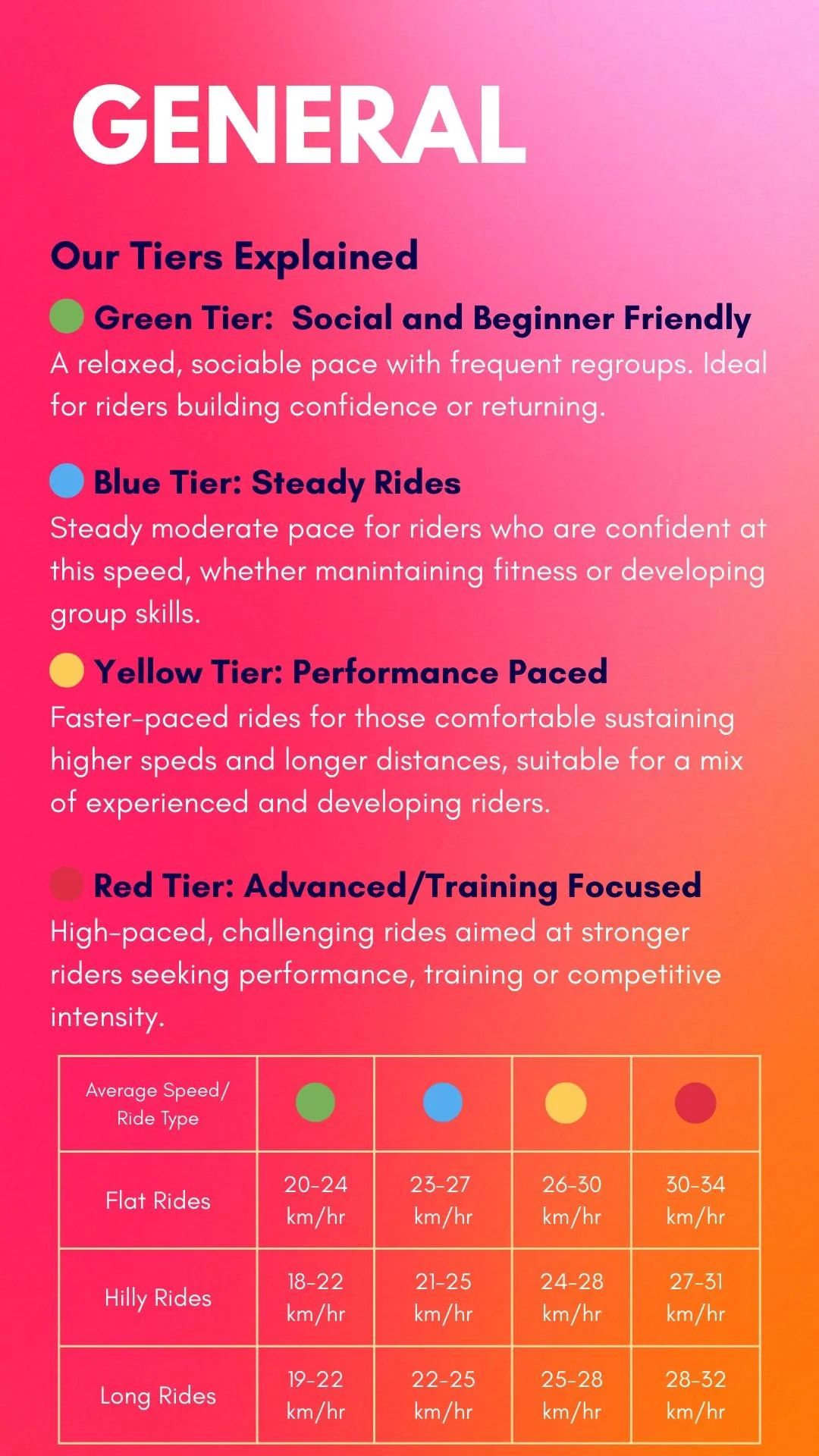 LDN RIDERS is an inclusive cycling club, but in order to not leave anyone behind, we categorise our rides into the tiers. When you join, you get placed into the Green Tier. If you wish to move up tiers, please contact hello@ldnriders.com